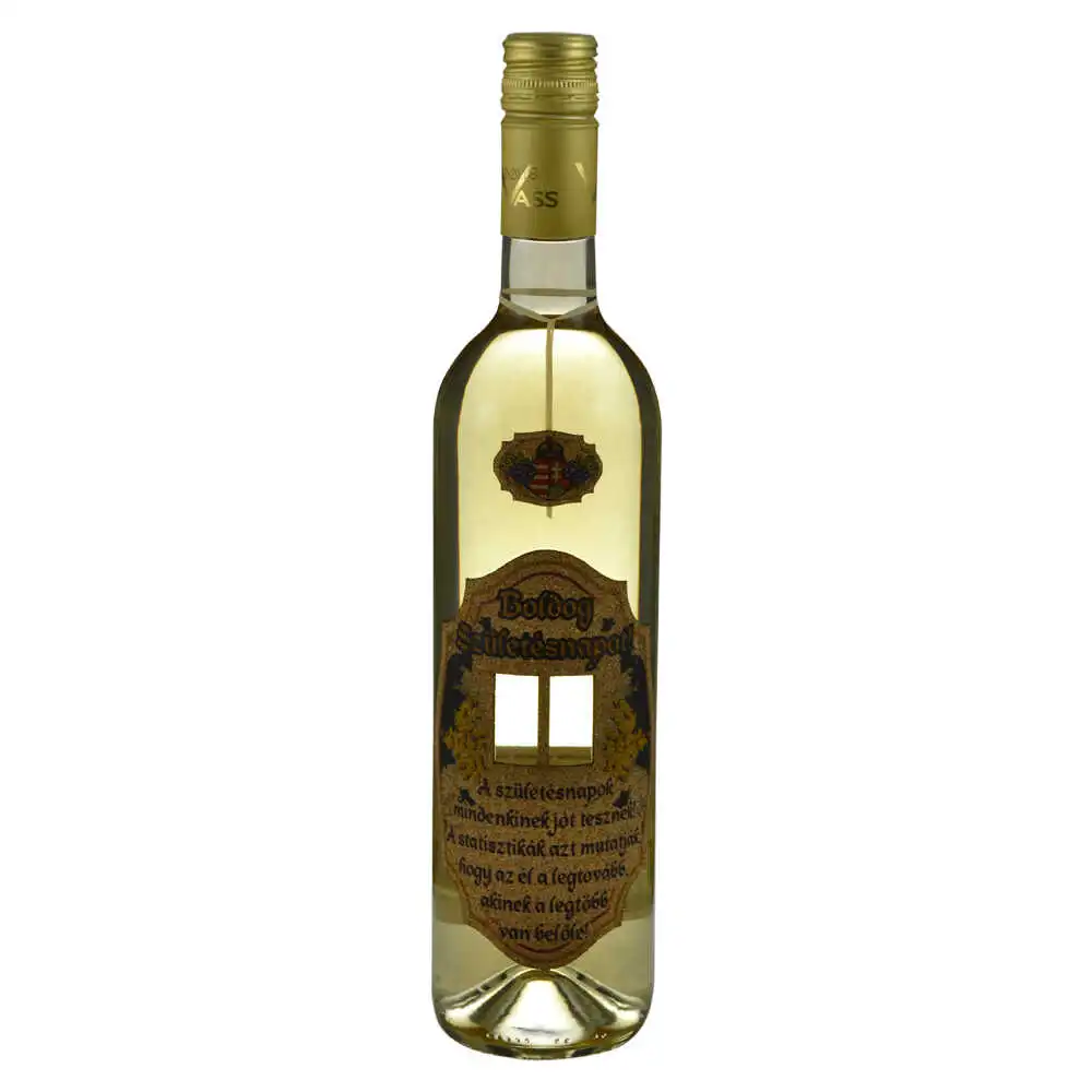 Vin alb 0.75l cu eticheta personalizata din pluta – Design „Boldog Szuletesnapot!” (Model 2)