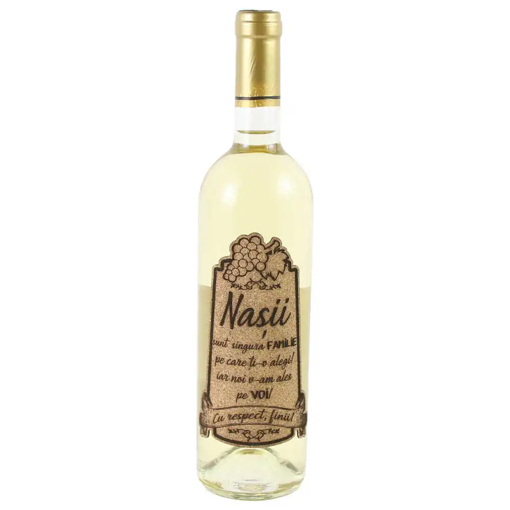 Vin alb 750 ml „Nasii sunt singura familie…” cu eticheta personalizata din pluta