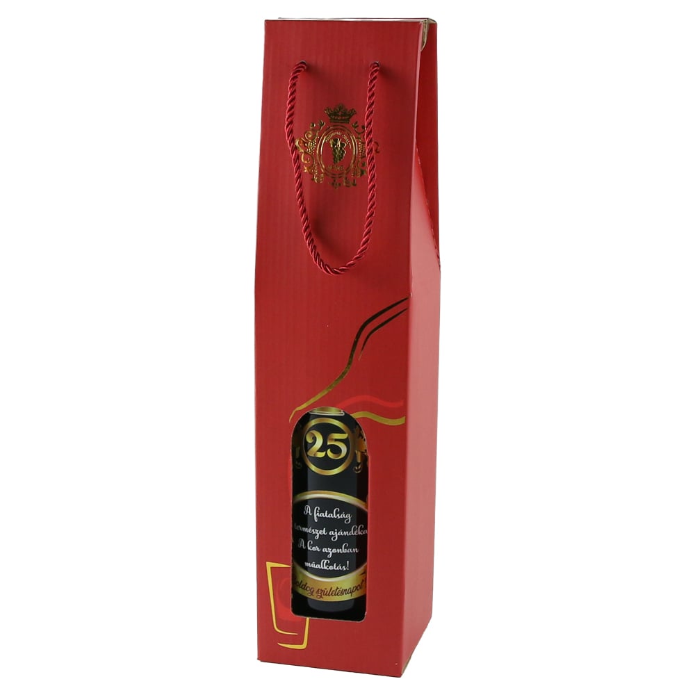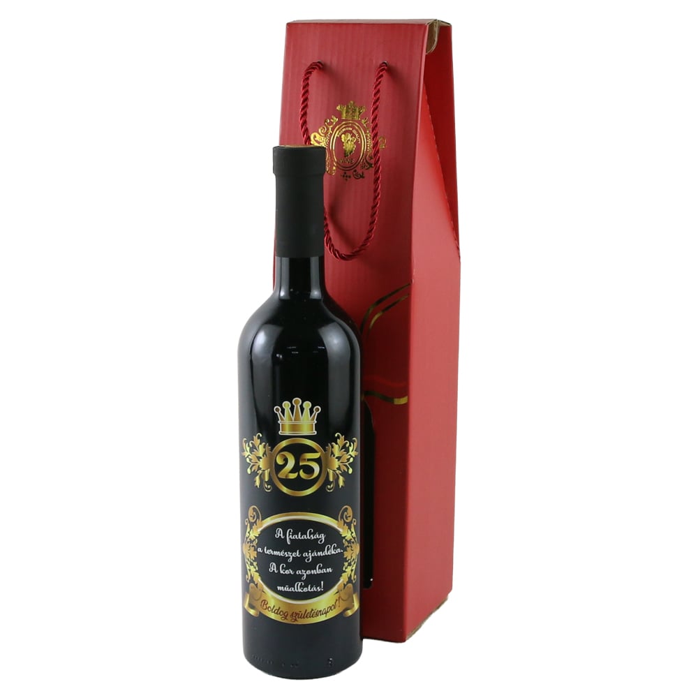 Vin rosu 750 ml „A fiatalsag a termeszet ajandeka…25, Boldgog Szuletesnapot!”, cu suport cadou