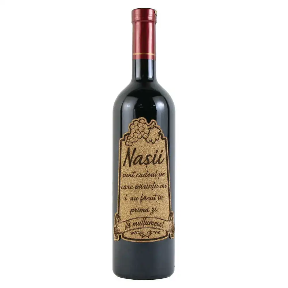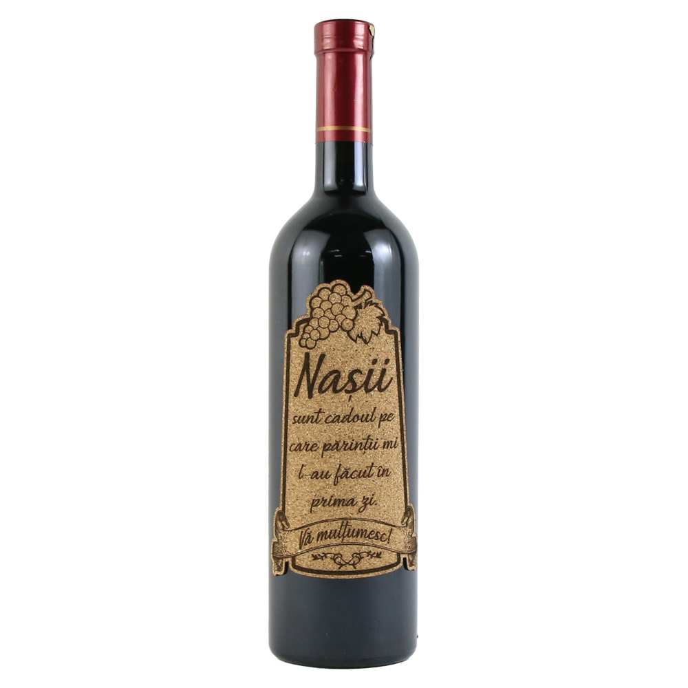 Vin rosu 750 ml „Nasii sunt cadoul…” cu eticheta personalizata din pluta