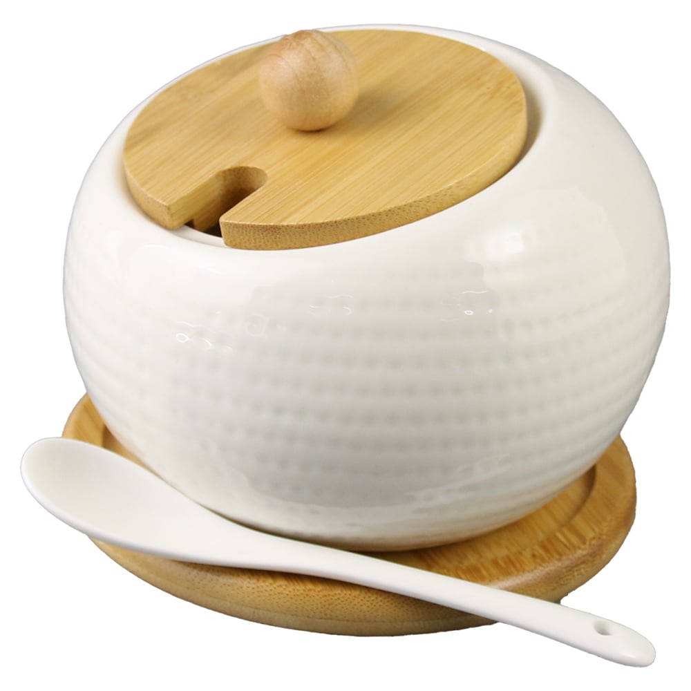 Zaharnita din ceramica cu lingurita, si capac si suport din bambus